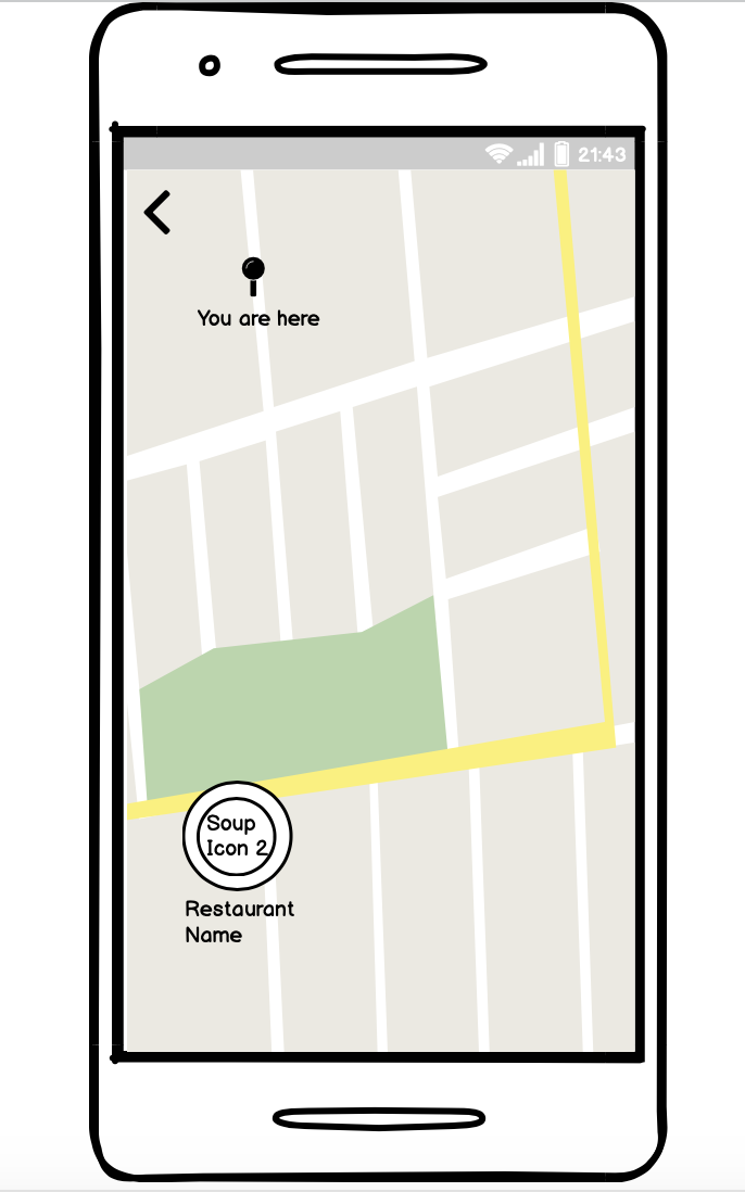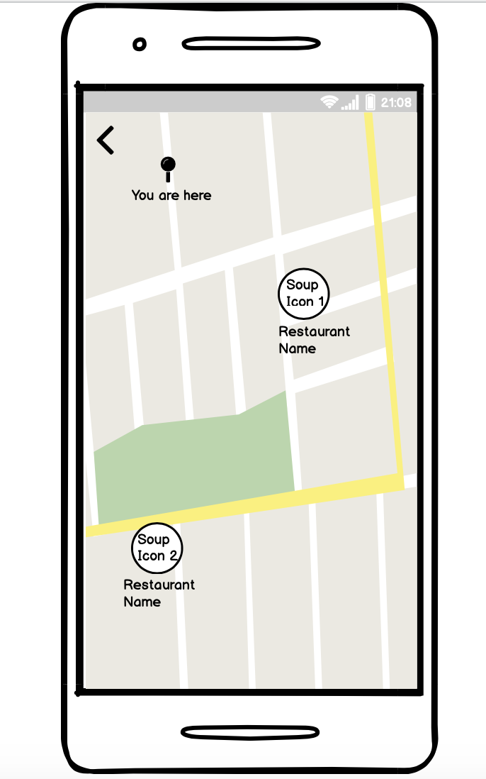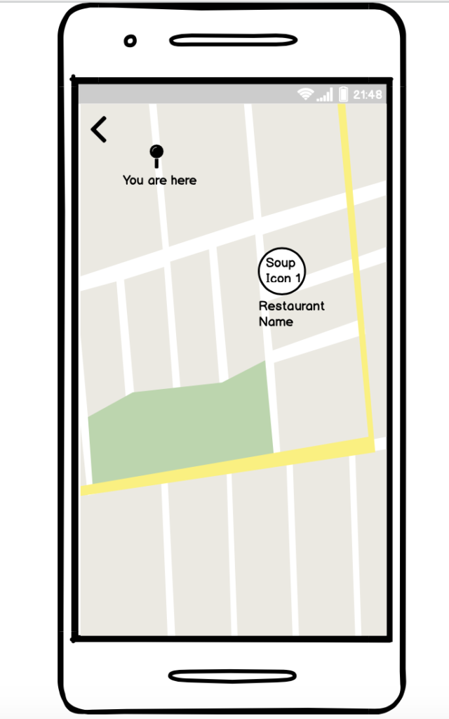The second scenario for which I drew wireframes was when the user comes to the application looking for a place to get some soup. In this scenario the type of soup is not important and the main goal is to find a way to get to a warm bowl of soup as fast as possible: