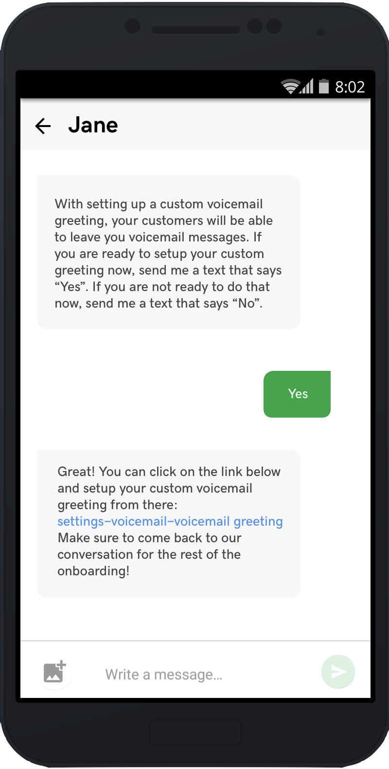 If the user says “Yes” and continues to setup their voicemail, they’ll be presented with a link that takes them to where they can record their custom voicemail. Upon returning from that page, the see a new message from Jane. The message congratulates them on having successfully setup a voicemail and directs them to where they can change it later if they need to.